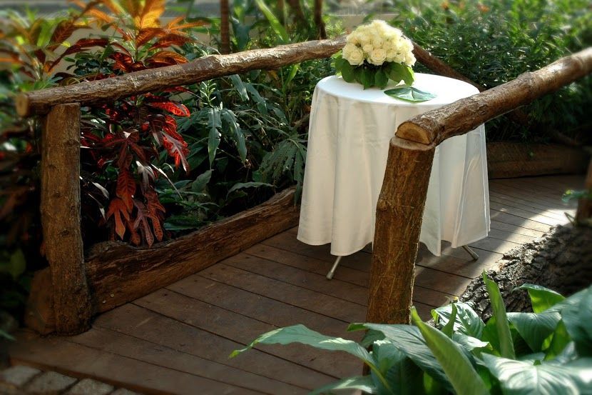 Im Schmetterlinghaus herrscht eine tropische Atmosphäre mit rund 26 Grad Celsius und 80% Luftfeuchtigkeit. Für Ihre Trauung senken wir die Luftfeuchtigkeit etwas und sorgen so für ein angenehmes Klima.